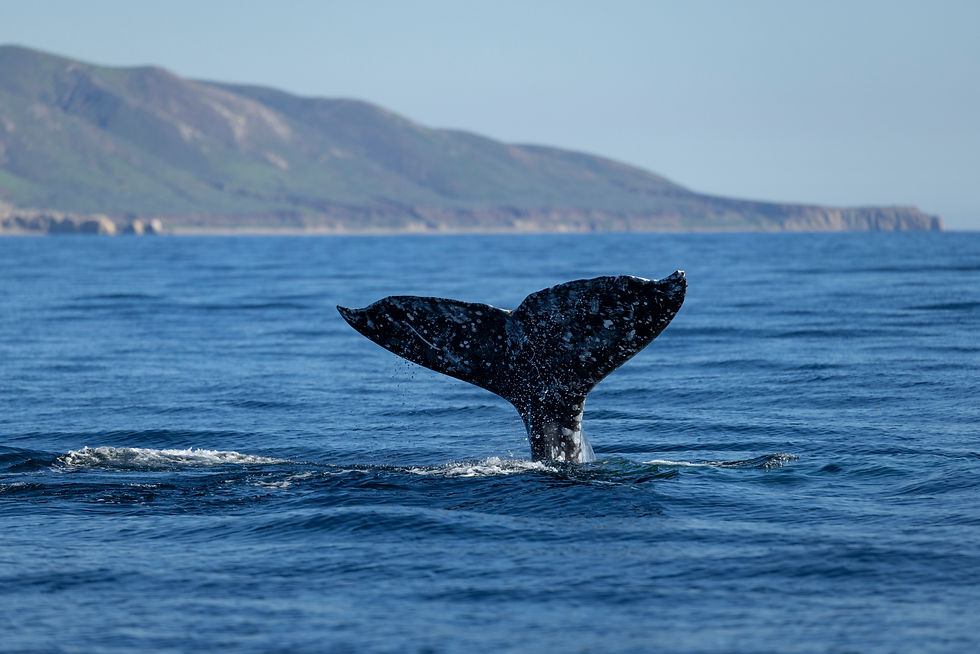 In the infamous "potato patch," the stretch of water between Santa Cruz and Santa Rosa islands, we found 2 gray whales. This area of water is known for being quite turbulent during the winter. Today's enounter however, greeted us with flat calm seas and sunny skies, caressed by green island backdrops!